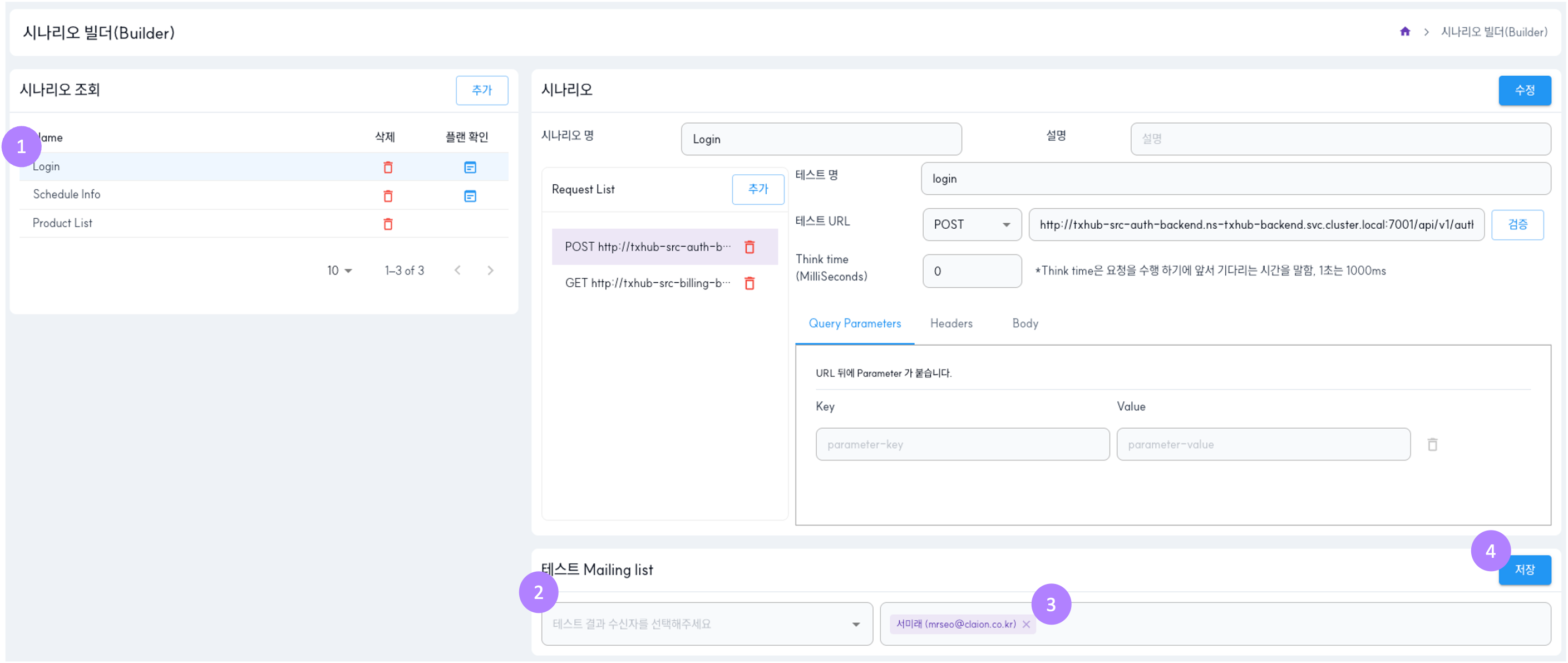 > <mark style="color:purple;">**해당 시나리오의 작업(시나리오, 플랜, 스케줄의 작성 및 스케줄 실행, 종료)시 알림 메일 수신자 설정을 제공합니다.**</mark>